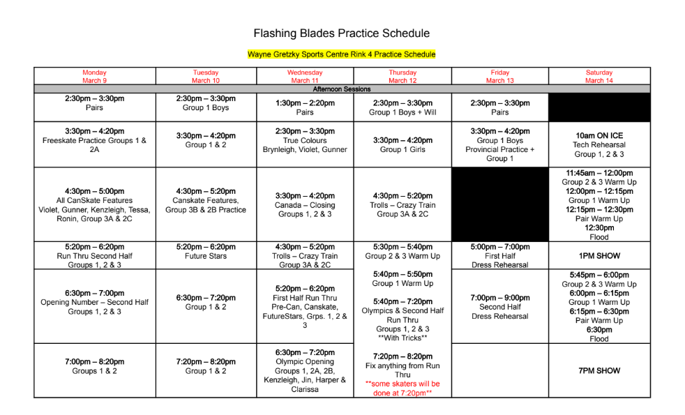 Much of the rehearsal for FB will take place during regular staking sessions. The 2 weeks prior to the Flashing Blades performance will involve varied practice times, and parents should be prepared for a flexible schedule. Any changes or updates to rehearsal times will be communicated via email.
